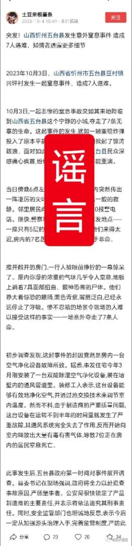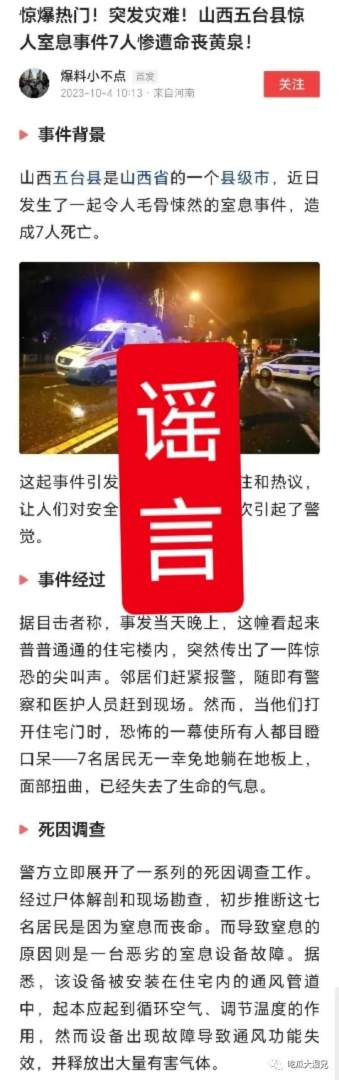 【#山西致7死窒息事故系家庭作坊中毒#】记者从山西省五台县委宣传部获悉,10月3日,山西省忻州市五台县豆村镇兴坪村一停产的家庭玉米加工作坊发生有害气体中毒事件,造成7人遇难。据了解,7人之间有亲属关系。目前,救援已经结束,原因正在调查中。