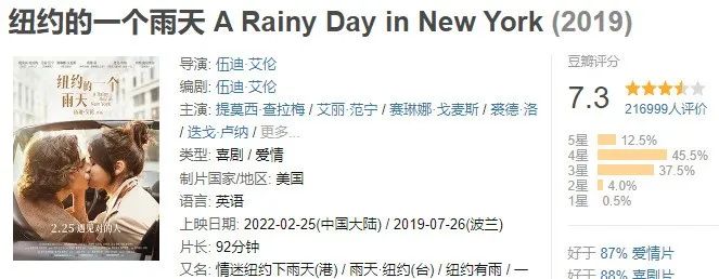 老头子再次装逼成功!这并不是一部找到真爱的浪漫爱情电影,而是一部血淋淋的《混圈装逼指南》。老头子一贯的高捧纽约上流社会的社会阶级鸿沟电影,电影里男女主角的“互不理解”并不是平等的性格差异,而是老头子想要表达的“纽约上流阶级圈层”是下面的人无法触达的。 伍迪艾伦今年已经83岁了。喜欢他的人只要看着他笔下的人物在镜头前碎碎念就能会心微笑:那些关于文学艺术音乐的名词在主人公飞快的语速中不断闪过,主角总是多少才华横溢自命不凡有点古怪有点小聪明还有点猥琐,看他在片中刻薄地讽刺上流社会