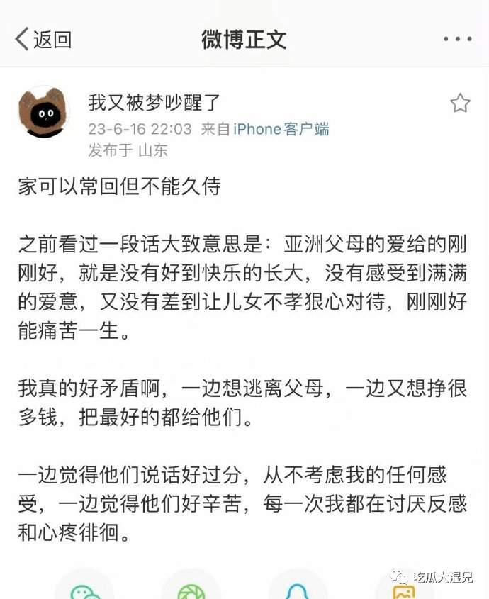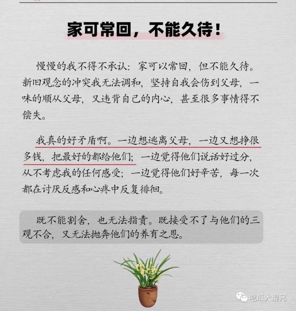 既不能割舍,也无法指责。既接受不了与他们的三观不合,又无法抛奔他们的养育之恩。#家可以常回 但不能久待# 有同意的小伙伴吗?