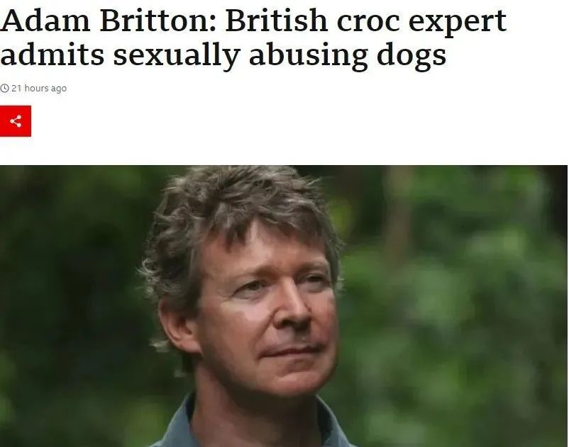 一位知名的鳄鱼专家亚当·布里顿被指控性侵和虐待超42只狗,其中39只不幸死亡。近日,澳大利亚法庭审理该案件,布里顿承认了37 项虐待动物罪、10 项强奸或试图强奸狗罪以及 4 项持有或传播虐待儿童材料的罪名。