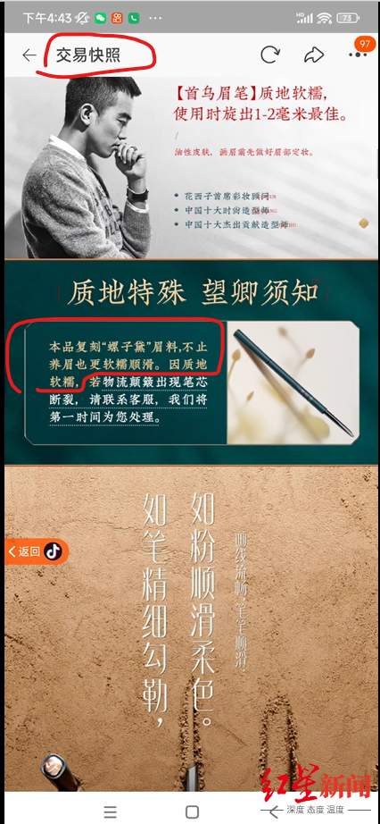 “一根眉笔芯体总共0.08克,排在配方表第20位的‘何首乌提取物’含量到底有多少可想而知,基本上可以视为没有,而该眉笔却被大肆宣传为‘首乌造眉笔’,引导受众以为‘何首乌’是眉笔的主要成分。”王海表示。