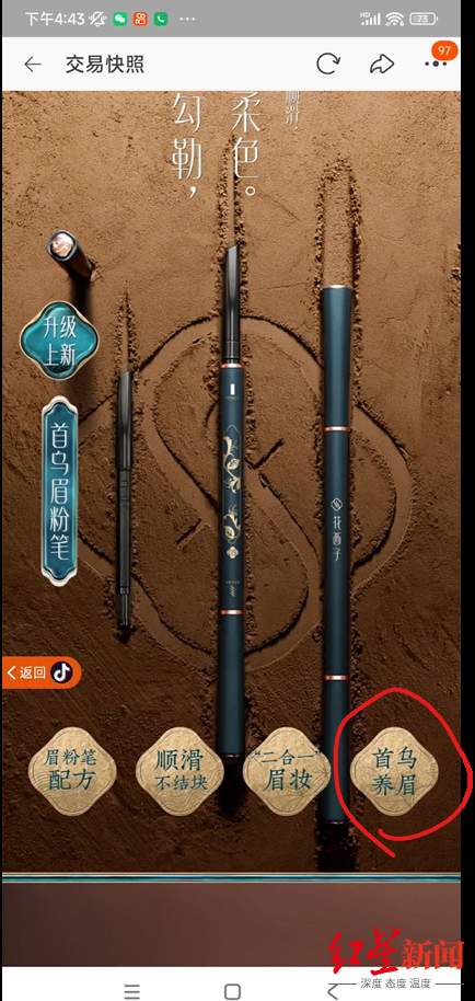 宣传中称该眉笔是“首乌造眉笔”,实际上何首乌提取物在备案成分上排第20名,倒数第一,“实际用量约等于无”;