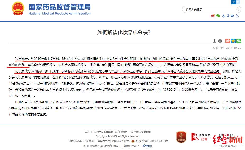 ▲国家药品监督管理局发布的文章《如何解读化妆品成分表?》