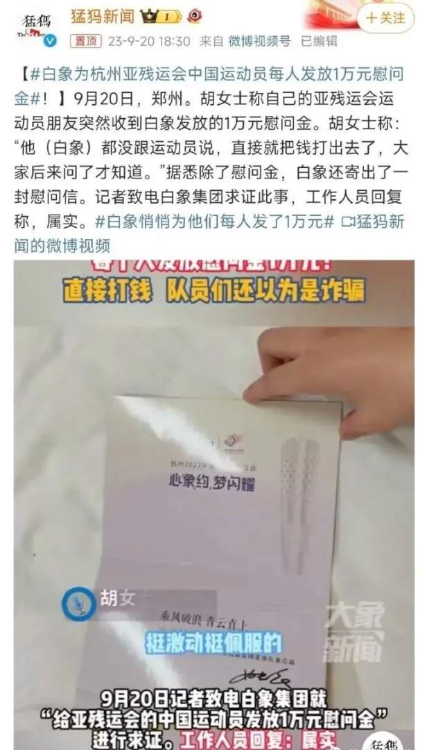 9月20日,郑州。胡女士称自己的亚残运会运动员朋友突然收到白象发放的1万元慰问金。