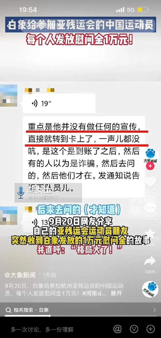 胡女士称:“他(白象)都没跟运动员说,直接就把钱打出去了,大家后来问了才知道。”