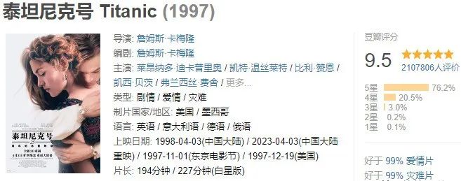 1912年4月10日,号称 “世界工业史上的奇迹”的豪华客轮泰坦尼克号开始了自己的处女航,从英国的南安普顿出发驶往美国纽约。富家少女罗丝(凯特•温丝莱特)与母亲及未婚夫卡尔坐上了头等舱;另一边,放荡不羁的少年画家杰克(莱昂纳多·迪卡普里奥)也在码头的一场赌博中赢得了下等舱的船票。