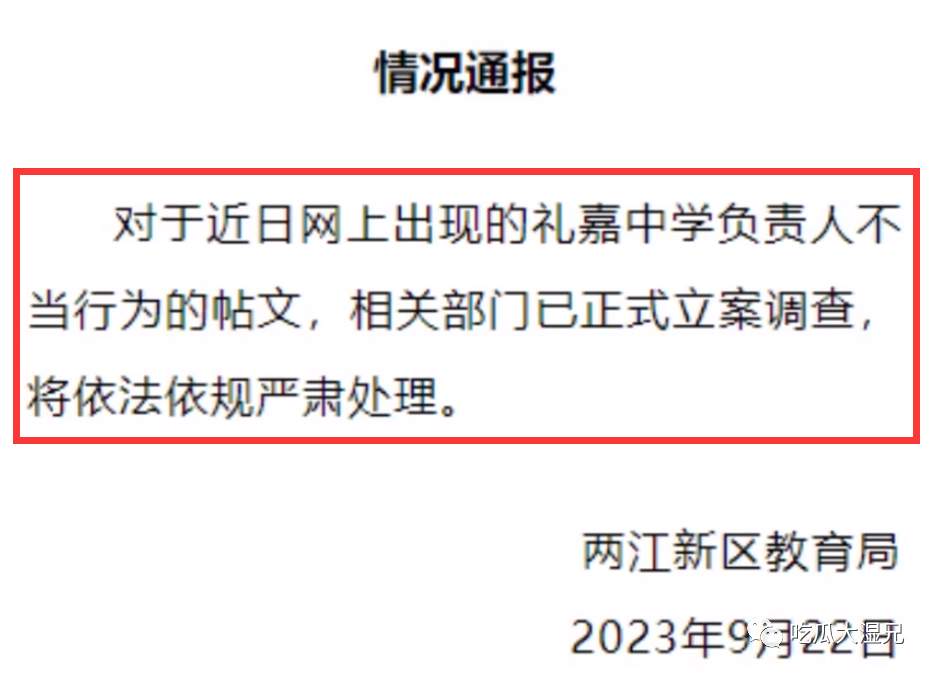 此事一经曝光,便在网络上掀起了轩然大波,随着事情的持续发酵,重庆两江新区教育局对此进行了通报,通报中表示:相关部门已经立案调查,后续将依法依规严肃处理。