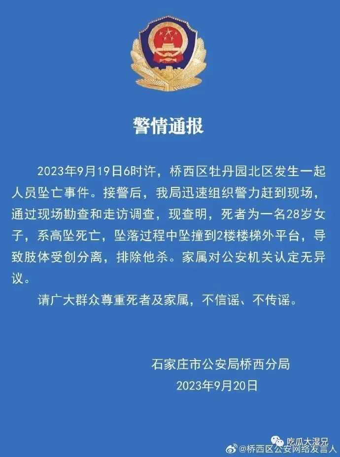 2023年9月19日6时许,桥西区牡丹园北区发生一起人员坠亡事件。接警后,我局迅速组织警力赶到现场,通过现场勘查和走访调查,现查明,死者为一名28岁女子,系高坠死亡,坠落过程中坠撞到2楼楼梯外平台,导致肢体受创分离,排除他杀。家属对公安机关认定无异议。