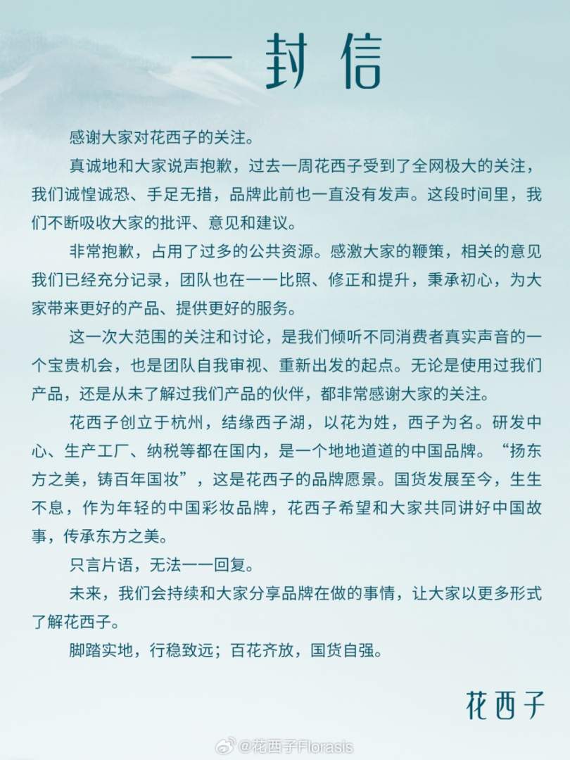 9月19日,花西子官方微博发布《一封信》,并声明称: