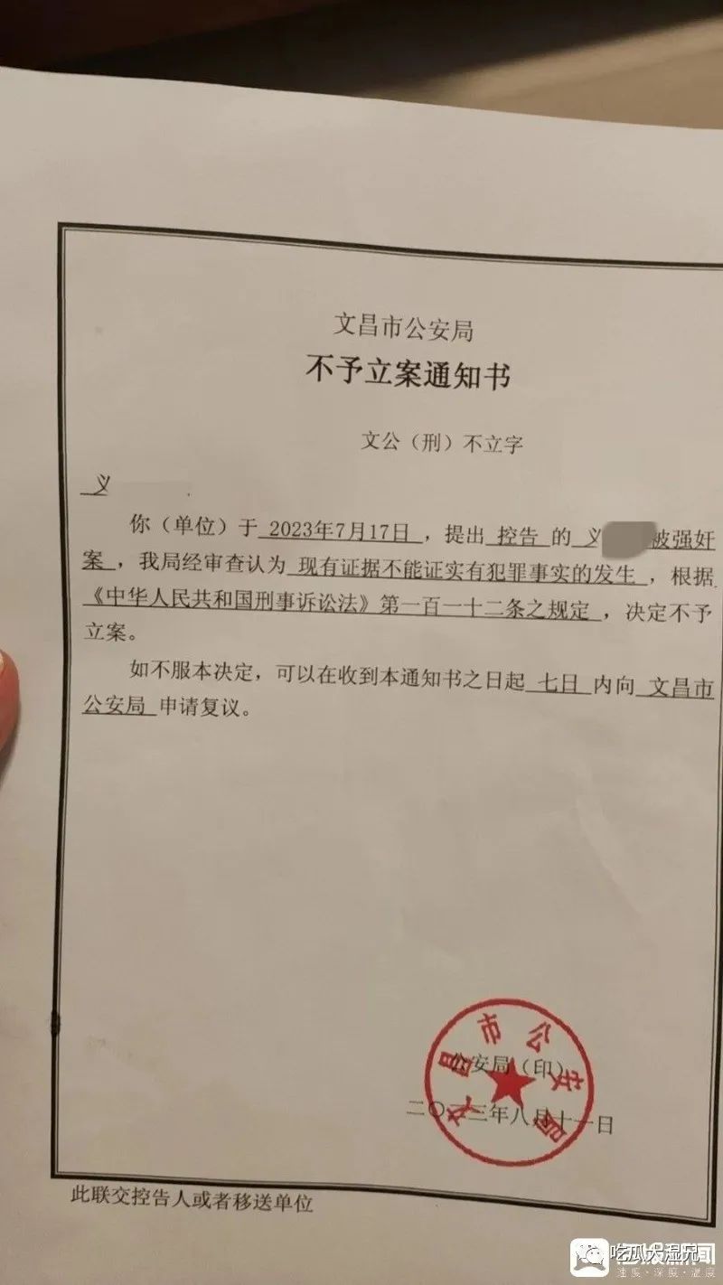 8月11日文昌市公安局出具的《不予立案通知书》显示,义女士报案被强奸,该局经审查认为现有证据不能证实有犯罪事实的发生,决定不予立案。此后,义女士家人申请复议。