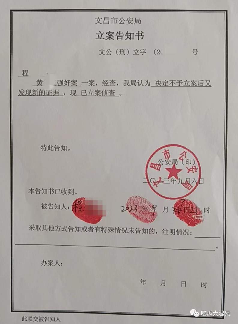 9月18日,红星新闻记者从程先生处了解到,9月6日,他收到的文昌市公安局的《刑事复议决定书》,该《决定书》显示,经审查,认为由于出现新的证据,撤销原认定证据不足的决定。后文昌市公安局出具的《立案告知书》显示,“黄某某强奸案”一案,经查,该局决定不予立案后又发现新的证据,现已立案侦查。