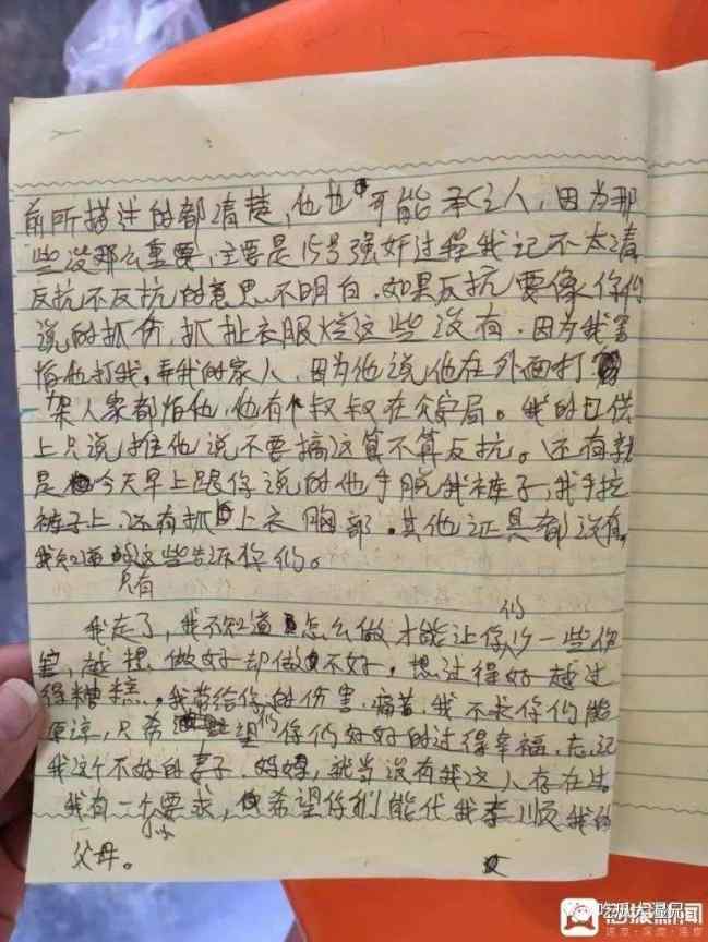 据程先生讲述,当天中午父女俩回家后,发现家里大门上了锁,义女士留下了一封遗书和一些现金。遗书中,她提到自己没有想到会被强奸,因为自己“不懂法,把嫌犯的犯罪罪证也弄丢了”,她觉得对不起这个家庭。此后,程先生和小程在家附近的水库中找到了已经去世的义女士。