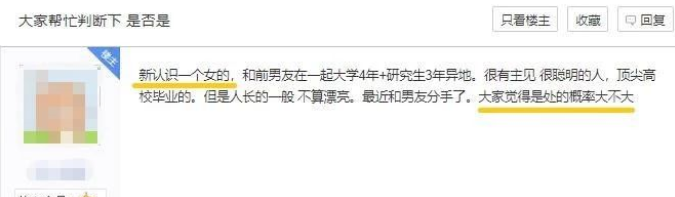 就好像这条帖子的作者,他以“形象7分以上的完美主义”自居,硕士学历,家庭背景中上。