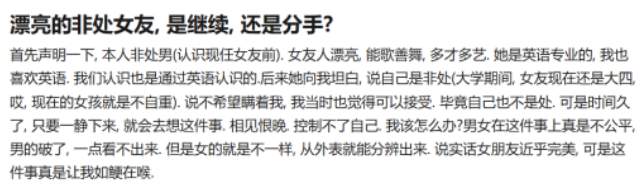 他称女朋友近乎完美,可不是处这件事让他如鲠在喉。