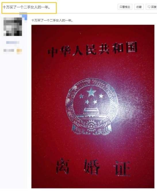有人就在” 十万买了一个二手女人的一年”标题之下直接晒出了离婚证,并用小作文讲了自己的故事: