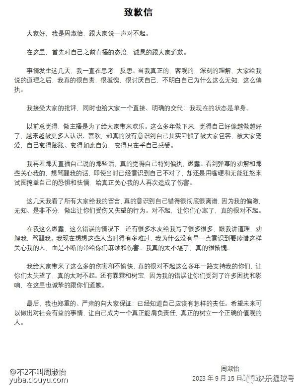 9月15日,游戏主播周淑怡就此前因与劣迹艺人PG one恋爱一事在社交平台进行致歉,同时对自己之前在直播的态度向粉丝道歉,接受批评的同时,直接、明确的交代:现在的状态是单身。这才几天呀,就和pgone分手了![[允悲]](/zb_users/upload/2024/05/wxsync-458440460664b727d563ff1716220541.png)