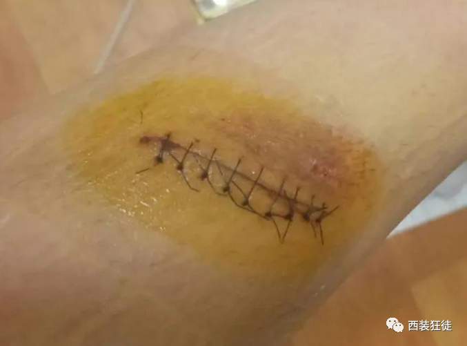 醒来已在医院,万幸腿没断,但破得厉害,缝了22针。