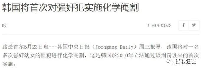 在韩国,强暴女性会遭受非常严厉的刑罚:如果未经女性同意实施强暴,罪犯会被戴上脚镣,甚至进行化学阉割。