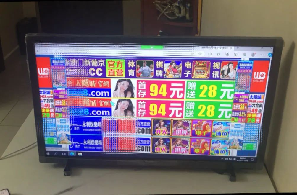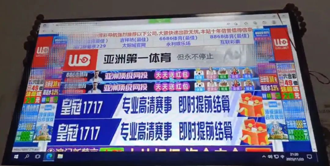 记者发现,打开电视最下方的浏览器,确实可以链接到赌博和色情网站。其中,色情网站的页面是各类色情图片和视频。除几张裸露照片外,赌博网站大部分是博彩类广告,比如“返水3.0%”“代理合营,返佣60%起”“欧洲杯玩球首选,五大联赛合作伙伴”等字样。