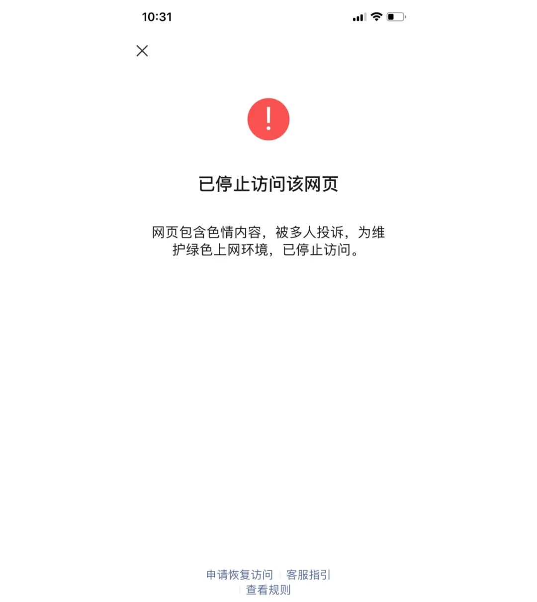 微信中点击同样的色情和赌博网址,页面显示停止访问(央广网发 手机截图)
