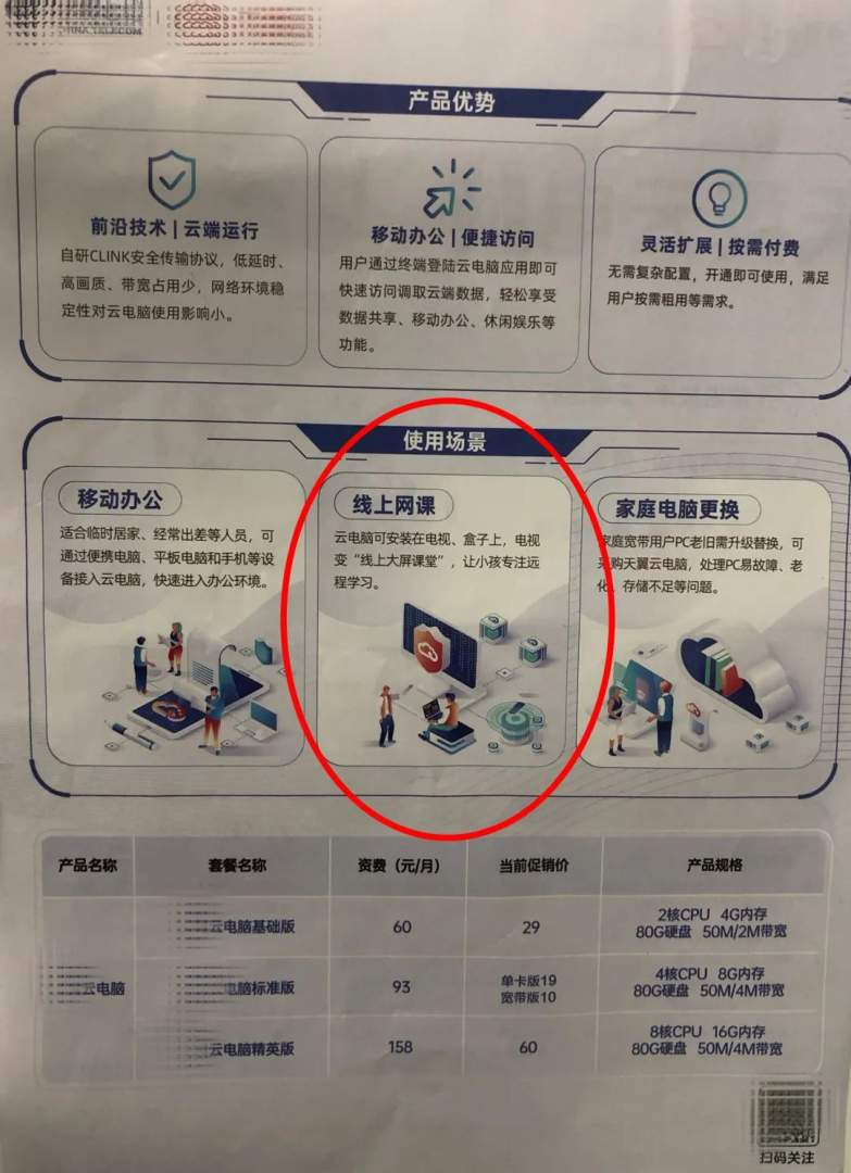 另外,云电脑宣传单在“使用场景”一栏写道:“在移动办公上,适合临时居家、经常出差等人员,可通过便携电脑、平板电脑和手机等设备接入云电脑,快速进入办公环境。在线上网课,云电脑可安装在电视、盒子上,电视变‘线上大屏课堂’,让小孩专注远程学习。”