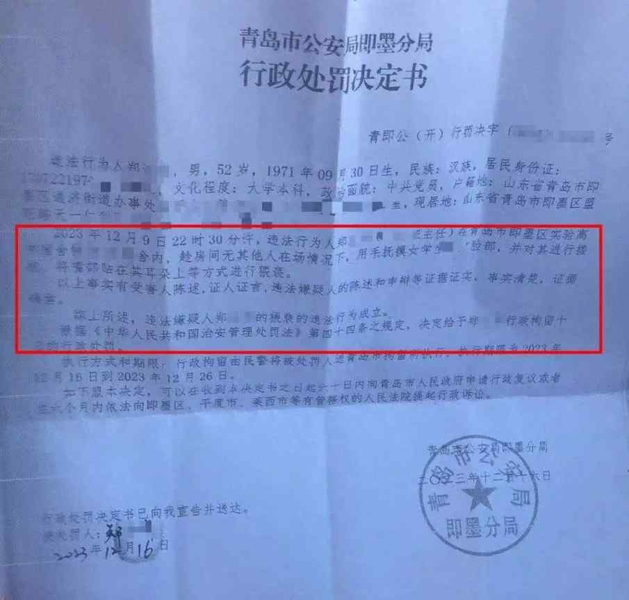 16日,该女生在其账号发了一份青岛市公安局即墨分局的行政处罚决定书。其中提到,违法行为人郑某某,52岁。2023年12月9日22时30分许,违法行为人郑某某在青岛市即墨区实验高中宿舍,趁房间无其他人在场情况下,用手抚摸女学生脸部,并对其进行搂抱,将嘴贴在其耳朵上等方式进行猥亵。以上事实有受害人陈述,证人证言,违法嫌疑人的陈述和申辩等证据证实,事实清楚,证据确凿。