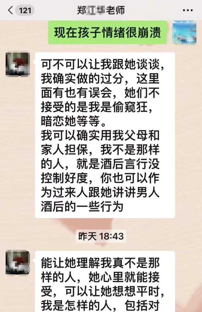 据网友发帖,其称自己是一名高三女生,就读于青岛市即墨区实验高中。因学校实行寄宿制,自己和另一名同学住一间寝室。12月9日,因她的室友走读回家,她一人在寝室。9日晚22时40分许,班主任郑某某酒后查寝,在其寝室时对她说“男人都是坏人”之类的话,还用手摸她的脸,对她进行搂抱。