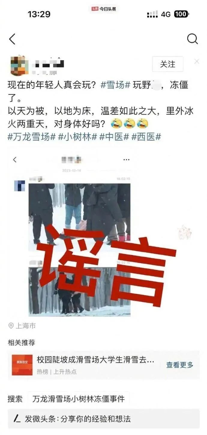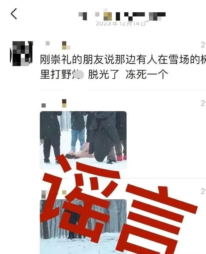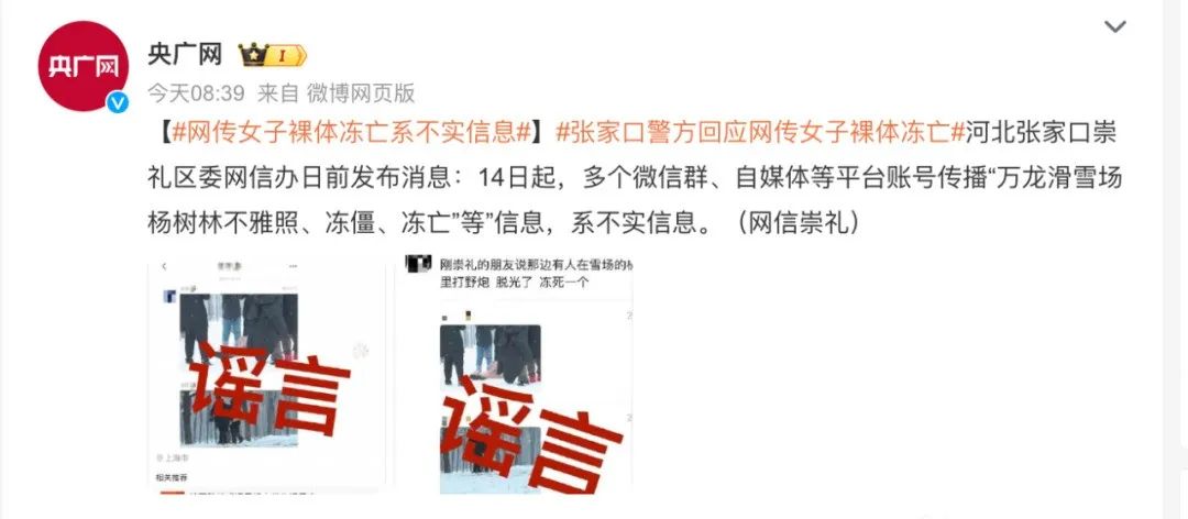 15日,网传一裸体女子在张家口崇礼区疑似发生冻亡事件,警方称已关注到网络上流传的信息并进行了辟谣