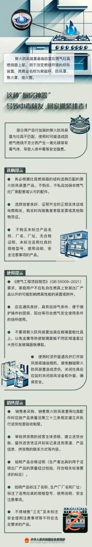 12月16日,中华人民共和国应急管理部、发布紧急提醒警惕所谓“厨房神器”。近年来,全国多地屡屡发生因使用聚能环而导致一氧化碳中毒的事件:2023年7月初,北京市海淀区西北旺镇航天城社区居委会在微信吃瓜网发布安全提示称,该镇域内发生一起因使用燃气灶聚能环(防风罩)引起一氧化碳中毒造成2人死亡的事故,要求居民立即停止使用聚能环。2022年,北京市石景山区永乐东区、燕保京原家园等小区发生多起居民自行加装聚能环致一氧化碳中毒事件;2021年,大连市西岗区日新街道唐山街一户居民因使用聚能环发生一氧化碳中毒;2021年,内蒙古包头市昆都仑区发生4起使用聚能环导致一氧化碳中毒事件。为什么这类聚能环会导致中毒?原因就在于部分用户自行加装的聚能环与灶具不匹配,使用时聚能环会堵塞氧气进气通道,造成燃气燃烧不充分产生大量一氧化碳,从而导致室内人员中毒。大连华润等多家燃气公司发布公告称,使用聚能环并不能起到节能效果——燃气会因为聚能环的遮挡导致不能充分燃烧,不完全燃烧产生的热量只有完全燃烧时的60%,因此在使用过程中反而会造成大量的燃气浪费。若使用不当,还会因为燃气燃烧不充分引发一氧化碳中毒。一些地方市场监管部门和应急管理部门曾多次发布安全提示。2022年,北京市市场监管局发布《关于燃气灶用聚火防风装置产品安全提示》,明确提示消费者“不应私自在燃具上安装出厂产品以外的可能影响燃具性能的装置或附件”。北京市通州区应急管理局、石景山区应急管理局、海淀区物业管理协会等机构也提醒市民,“私自加装燃气灶聚火防风装置会产生很大安全隐患”。陕西榆林、新疆乌鲁木齐、黑龙江佳木斯等地已明令禁止使用聚能环。记者采访发现,尽管相关部门长期宣传该产品的危险性,但大多数受访社区居民表示,平时较少关注此类安全事故报道,日常在社区宣传栏等场所也没有看到安全提示,不太了解其危险性。相反,由于一些商家长期宣传聚能环具有提高烹饪效率、节约燃气功效,产品受到不少消费者青睐。记者在国内多家电商平台搜索发现,当前通过网络销售聚能环的店家不在少数。例如,在国内某知名电商平台上搜索“燃气灶防风罩节能环”关键词,平台显示共有5000多件商品,价格最贵的200元左右,最便宜的只需3至4元。销售数据显示,多家店铺销量已破10万件。当记者就产品质量、合格证明问询商家时,均被回应“无法提供产品质检报告”。记者下单购买了一款售价13.9元的聚能环。产品说明书上的“注意事项”只提及“严禁直接在玻璃灶面上使用”,不但未提燃气燃烧不充分可能引发一氧化碳中毒的危险,反而声称“本品能使燃气充分燃烧,减少有毒气体一氧化碳排放量50%-80%”。据天眼查显示,该生产厂商位于浙江省永康市,登记为个体工商户;在国家标准化管理委员会官网上查询该产品合格证信息发现,该产品不仅没有登记在案,反而涉嫌盗用别家企业信息。国务院公布的《城镇燃气管理条例》第二十八条规定:燃气用户不得擅自安装、改装、拆除户内燃气设施和燃气计量装置。《燃气工程项目规范》(GB 55009-2021)要求,家庭用户不应私自在燃具上安装出厂产品以外的可能影响燃具性能的装置或附件。市场监管总局认证监管司有关负责人说,聚能环不属于强制性产品认证范围。根据专家反馈,聚能环可能影响燃气灶具燃烧器火焰周围的空气流动,对正常燃烧工况产生不利影响,从而引发一氧化碳超标等问题。建议用户不要擅自在原装燃气灶具上加装聚能环。使用聚火防风装置产品时,有哪些注意事项?燃气灶用聚火防风装置产品安全提示,一起了解↓↓↓